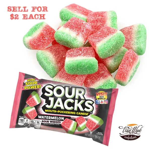 Get ready to pucker up with our exclusive sour candy duo: the explosively tart $2 Nuclear Sqworms and the wildly juicy $2 Sour Jacks Watermelon. Each 2-flavor pack includes 60 pieces of each, delivering a one-two punch of mouthwatering flavor that keeps supporters coming back for more.